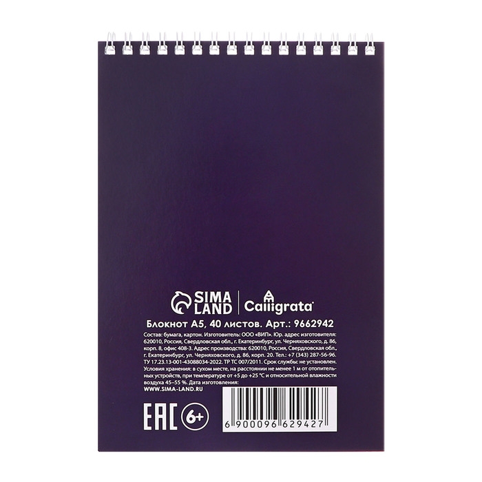Блокнот А5, 40 листов в клетку на гребне "Синий", обложка мелованный картон, блок офсет