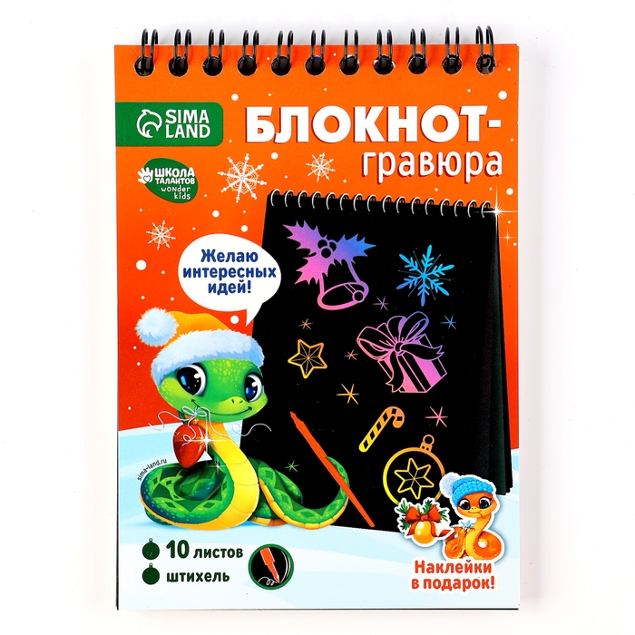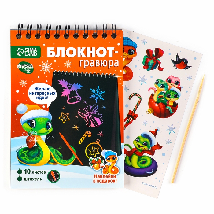 Блокнот гравюра на новый год «Радостная змея», 10 листов, лист наклеек, А6, новогодний набор для творчества