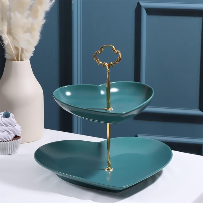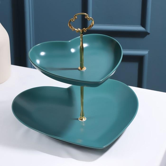 Блюдо керамическое 2-х ярусное «Сердца», 19×18/26×25 см, цвет зелёный