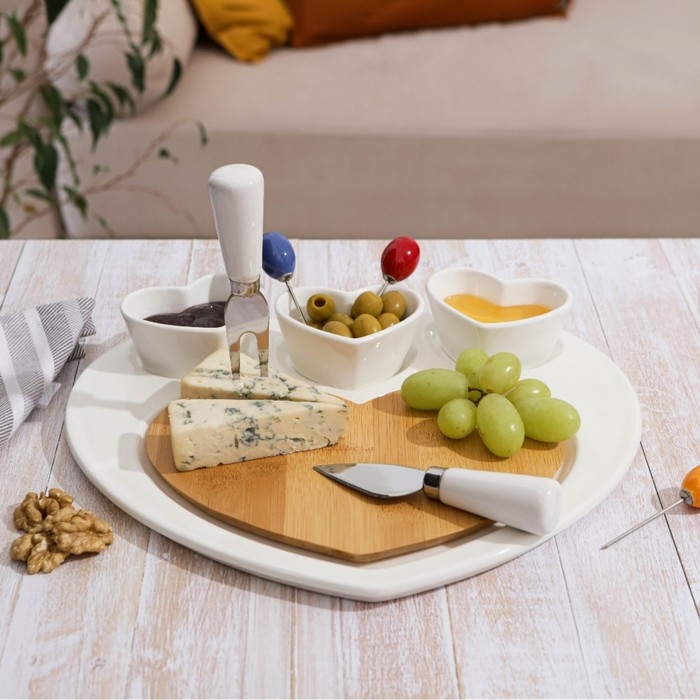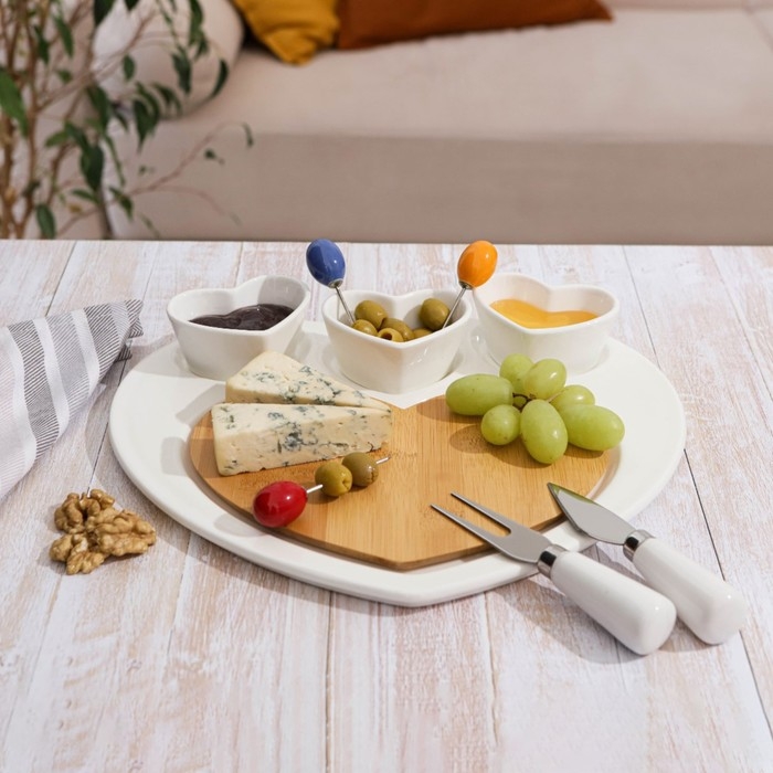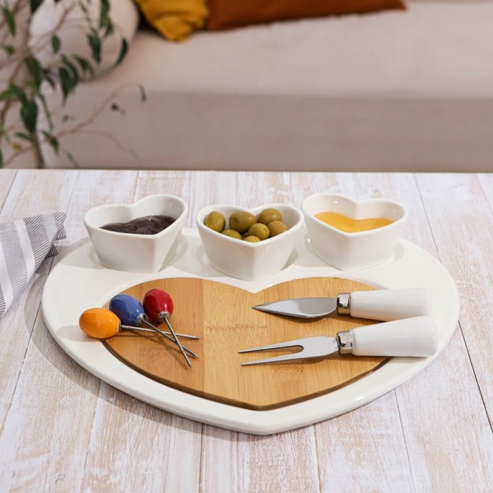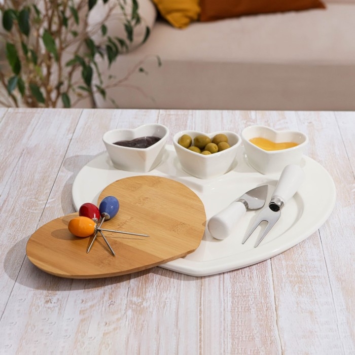 Блюдо керамическое для подачи «Эстет. Сердце», 8 предметов: 3 соусника 8×6×4 см, 3 шпажки, нож, вилочка, цвет белый