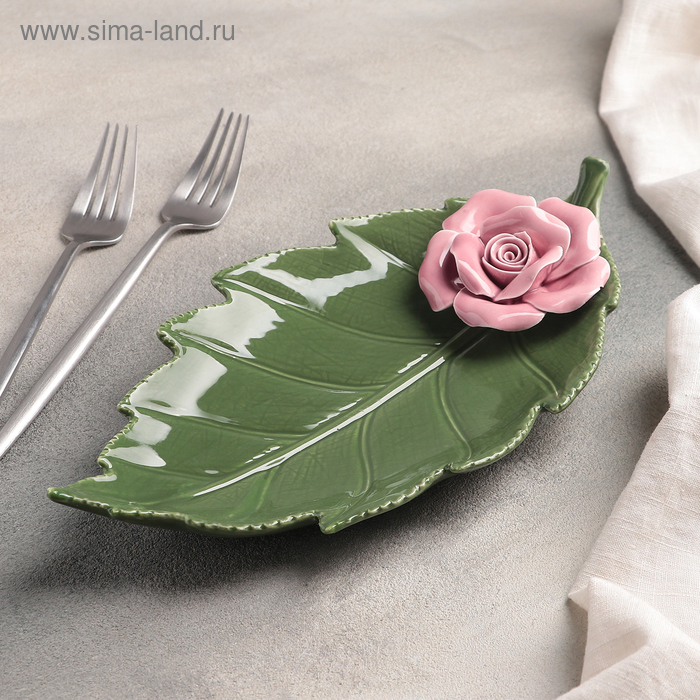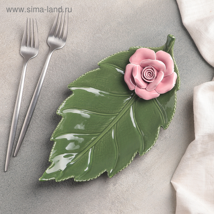 Блюдо керамическое сервировочное «Лист с розой», 27×14×4,5 см, цвет зелёно-розовый