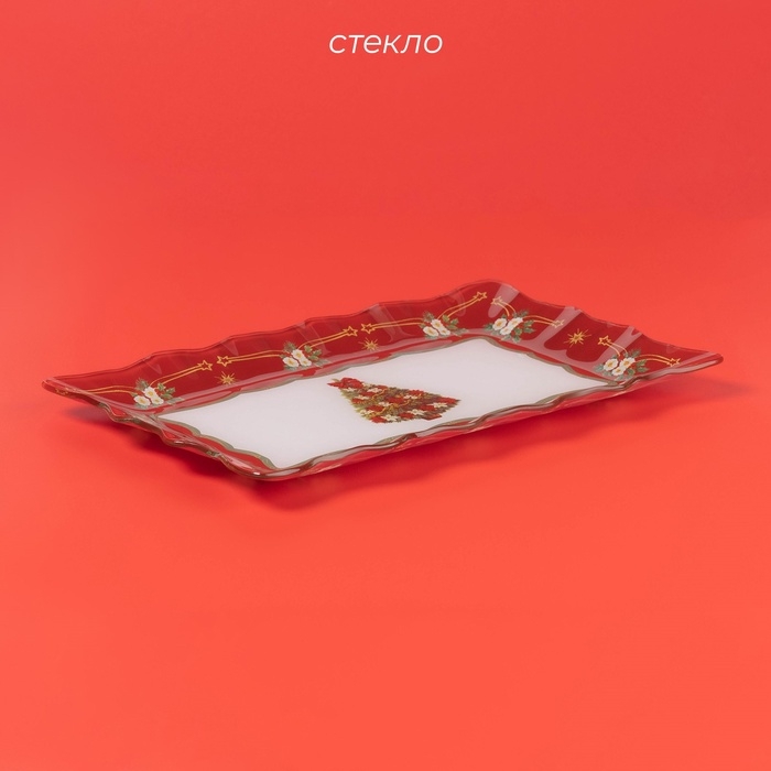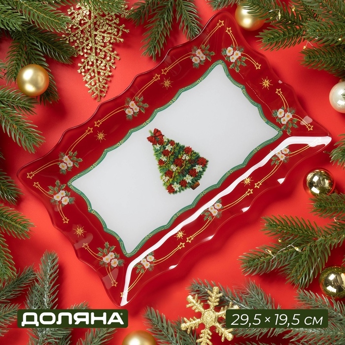 Блюдо стеклянное прямоугольное Доляна «Новогодняя ель», 29,5×19,5 см, цвет красный