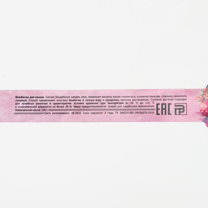 Состав: бикарбонат натрия, соль, лимонная кислота, масло гелиантуса, соцветия лаванды, отдушка, краситель пищевой.