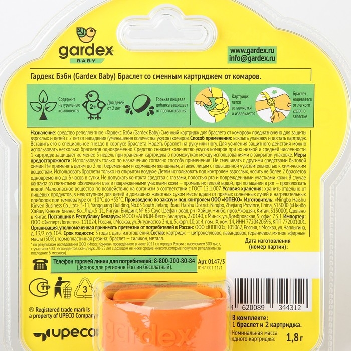 Браслет от комаров "Gardex Baby", с 2 сменными картриджами