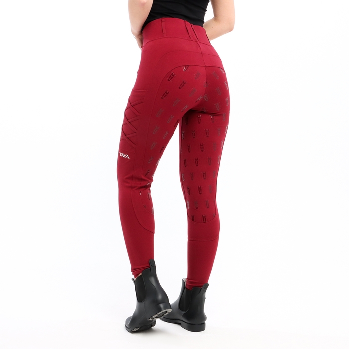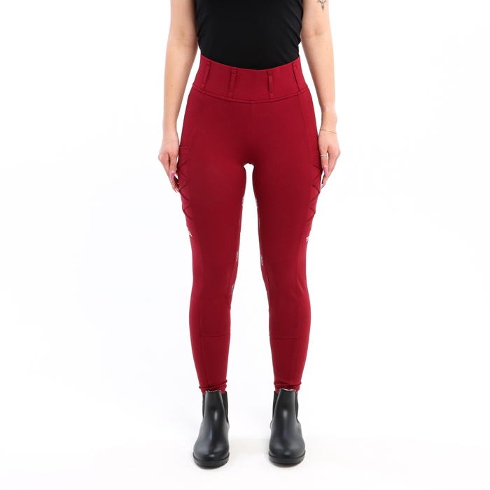Спортивные бриджи для верховой езды «Aphrodite» представляют новую коллекцию «Pantheon» бренда TAYA Equestrianism. По ощущениям такие бриджи столь же комфортные, как и обычные женские спортивные лосины, но при этом имеют боковые карманы, а также полную силиконовую лею, которая надежно удержит в седле при любых обстоятельствах. Бордовые бриджи данной линейки имеют крепкие, максимально износостойкие, но вполне мягкие швы, а достаточно высокая талия и плотная посадка на широкой резинке пояса отлично защищает поясницу от продувания при активной езде или при использовании в комплекте с коротким спортивным топом. Данные конные бриджи с карманами, причем удобными, так как в них вмещаются не только мелкие вкусняшки для лошади, но и, к примеру, полностью помещается смартфон без вероятности его выпадения во время конкура или выездки. В них легче и проще переносить летнюю жару и можно считать своим стандартным всесезонным вариантом для не экстремальных температур.