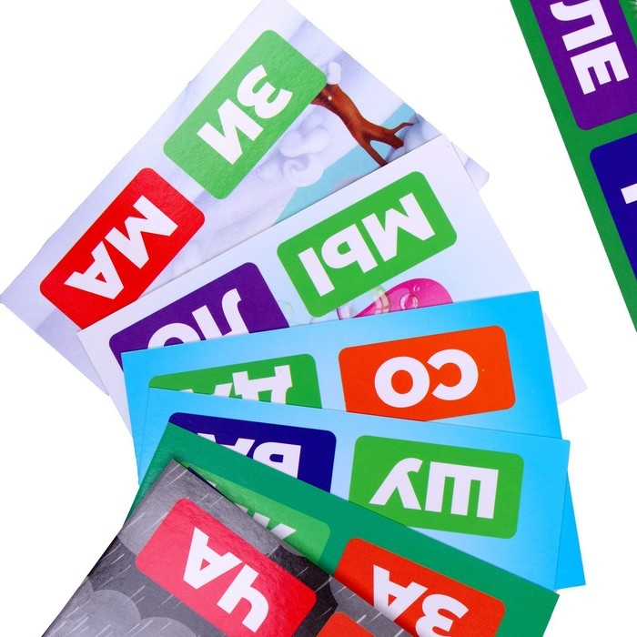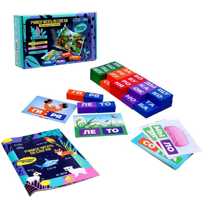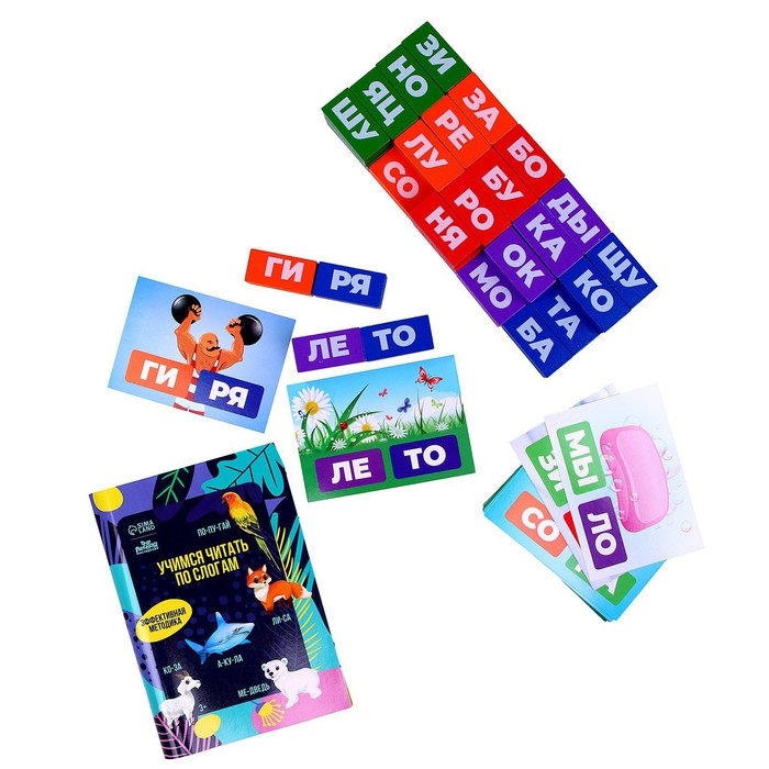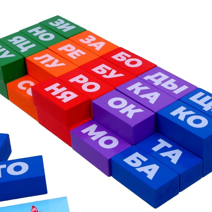 Эта игра будет интересна и полезна как малышам, так и школьникам. В наборе идёт 30 карточек с заданиями и 40 деталей со слогами.