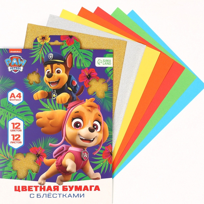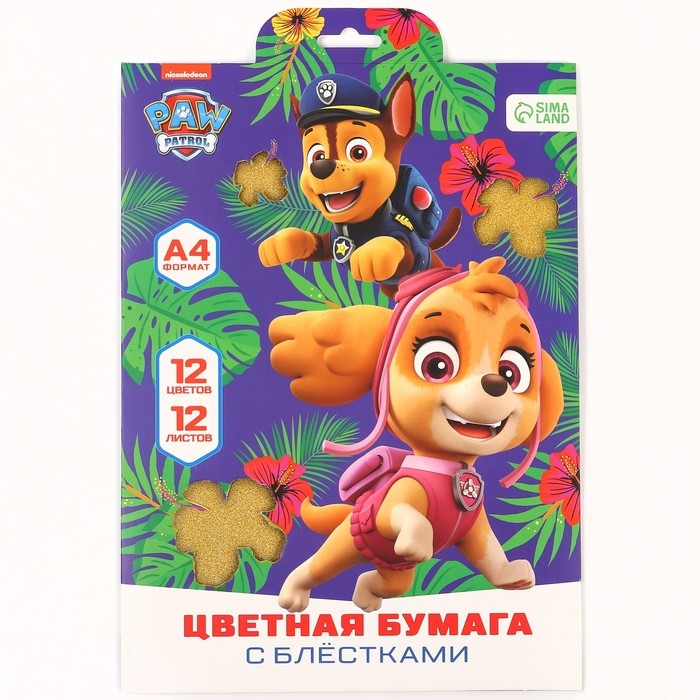 Бумага цветная с блестками, А4, 12 листов, 12 цветов, немелованная, двусторонняя, в папке, 80 г/м², Щенячий патруль