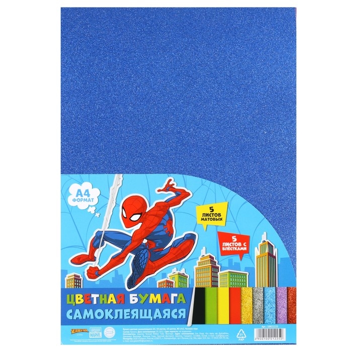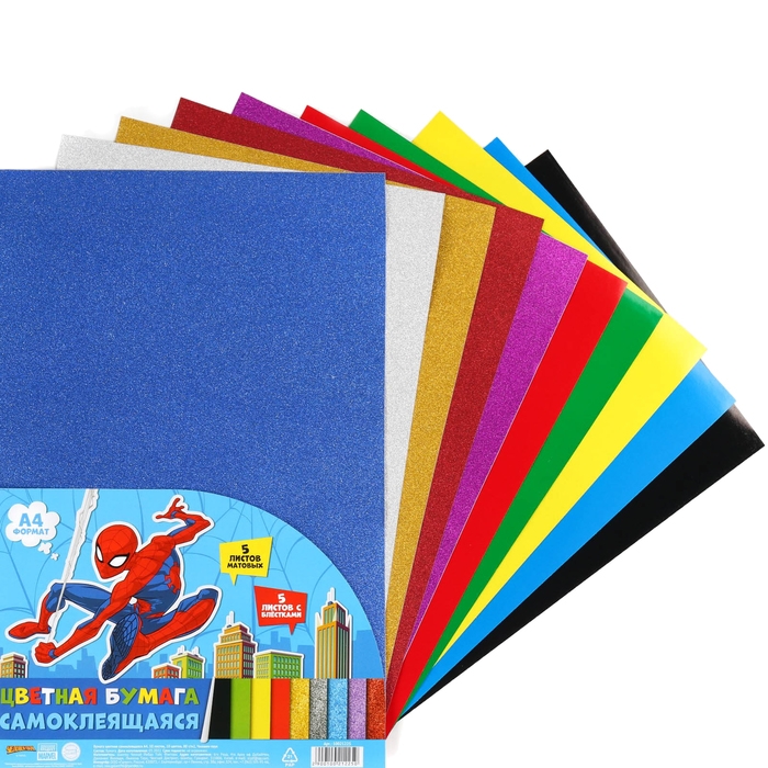 Бумага цветная самоклеящаяся, с блёстками, А4, 10 листов, 10 цветов, мелованная, односторонняя, в пакете, 80 г/м², Человек-паук