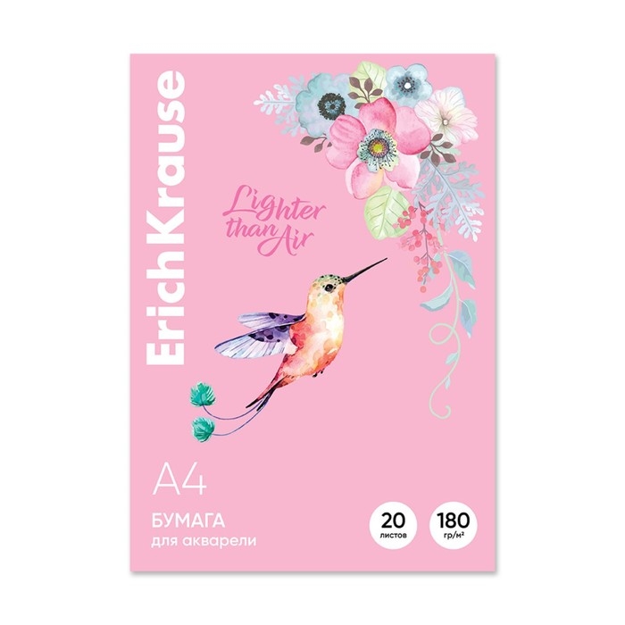 Бумага для акварели А4, 20 листов, ErichKrause "Колибри", блок 180 г/м², 100% белизна, в картонной папке