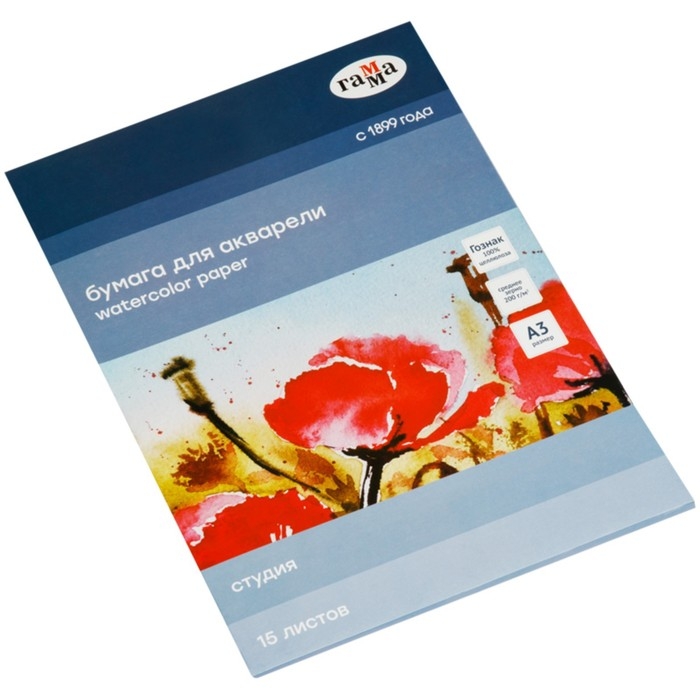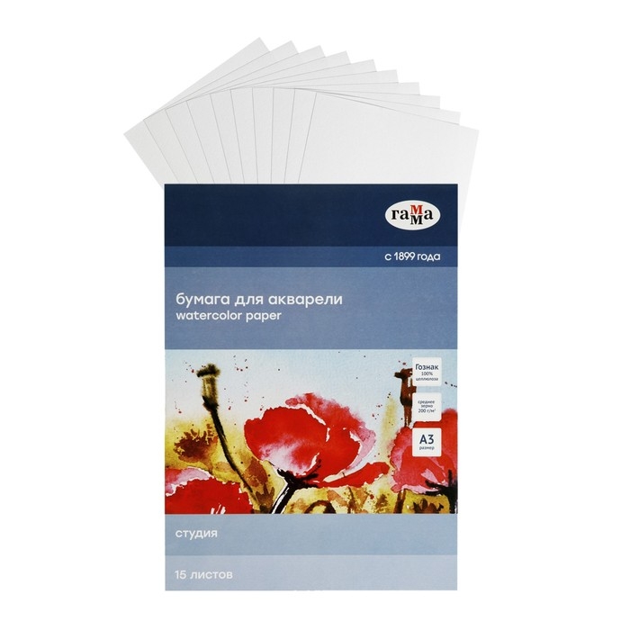 Папка для акварели ГАММА серии «Студия» формата А3 (295*415 мм) плотностью 200 г/м2 средней зернистости, марки А. В папке 15 листов, изготовленных из 100% целлюлозы на заводе «Гознак» без использования оптических отбеливателей. Бумага обладает естественным белым цветом, идеально подходит для водных техник, хорошо впитывает влагу, не деформируется от воздействия воды. Благодаря среднезернистой фактуре и плотности она отлично подходит под многослойные сложные работы карандашами, а также для смешанных техник. Папка представлена в картонной обложке.