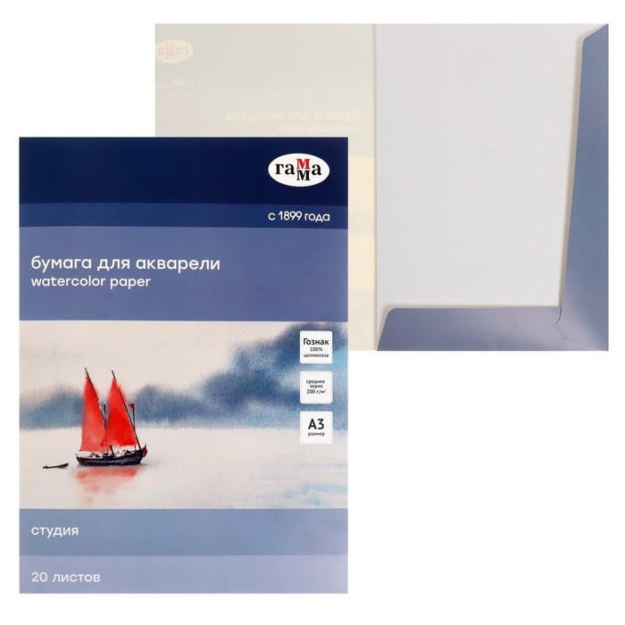 Бумага для акварели в папке А3, 295 x 415 мм, 20 листов, Гамма "Студия", 200 г/м2, среднее зерно (30C03F720W)