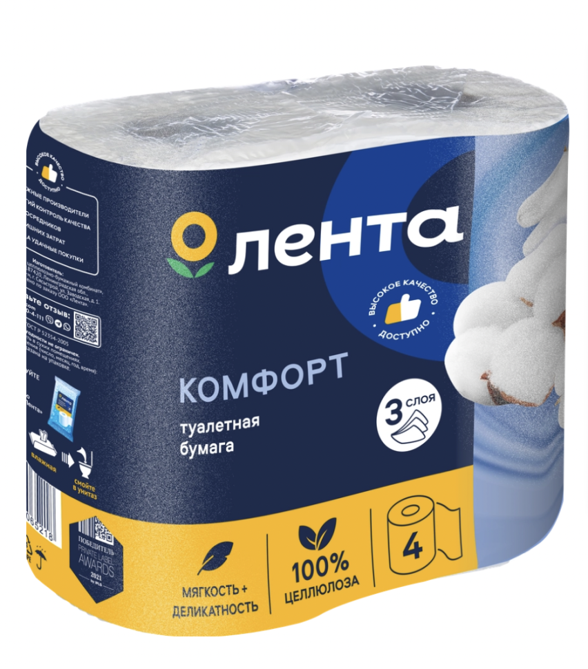 Россия. Бумага туалетная ЛЕНТА трехслойная экономит семейный бюджет и остается комфортной и приятной в использовании. Она создана из качественной целлюлозы, деликатно очищает и мягко заботится о вашей коже каждый день.