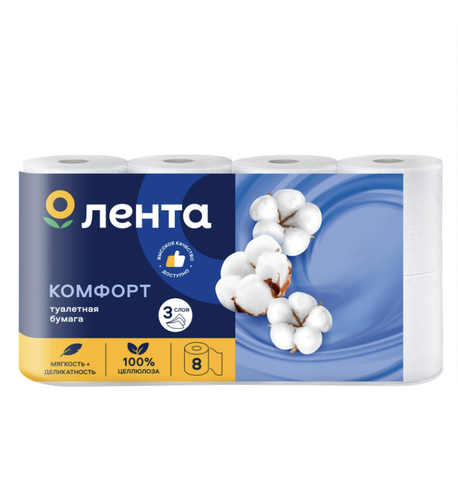Россия. Бумага туалетная ЛЕНТА трехслойная экономит семейный бюджет и остается комфортной и приятной в использовании. Она создана из качественной целлюлозы, деликатно очищает и мягко заботится о вашей коже каждый день.