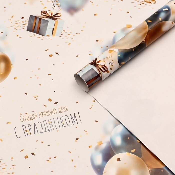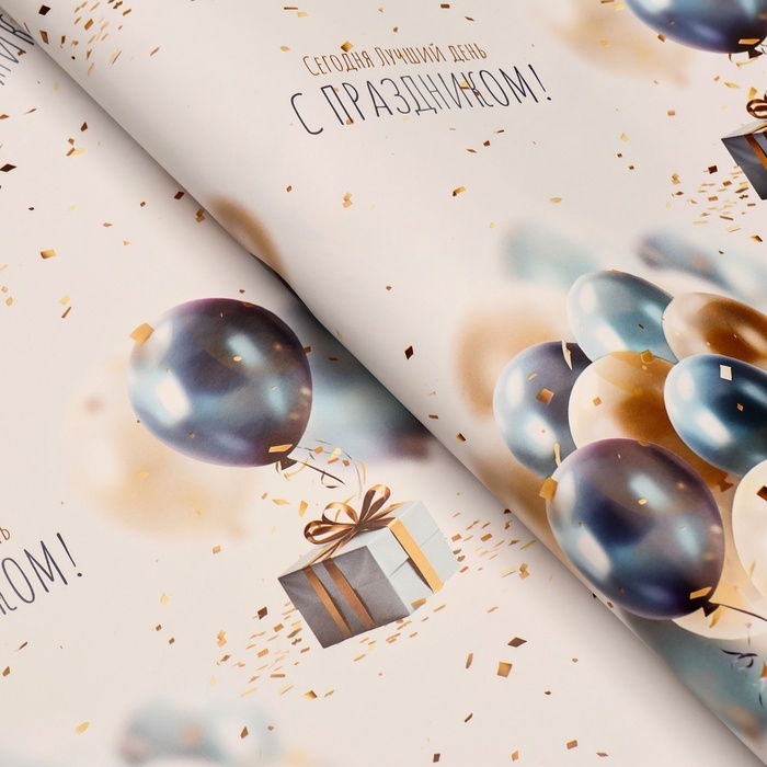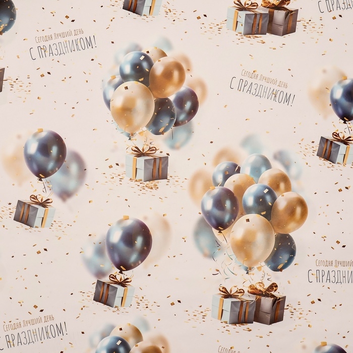Бумага упаковочная, глянцевая "С днем рождения", подарки с шариками, 70 х 100 см, 1 лист
