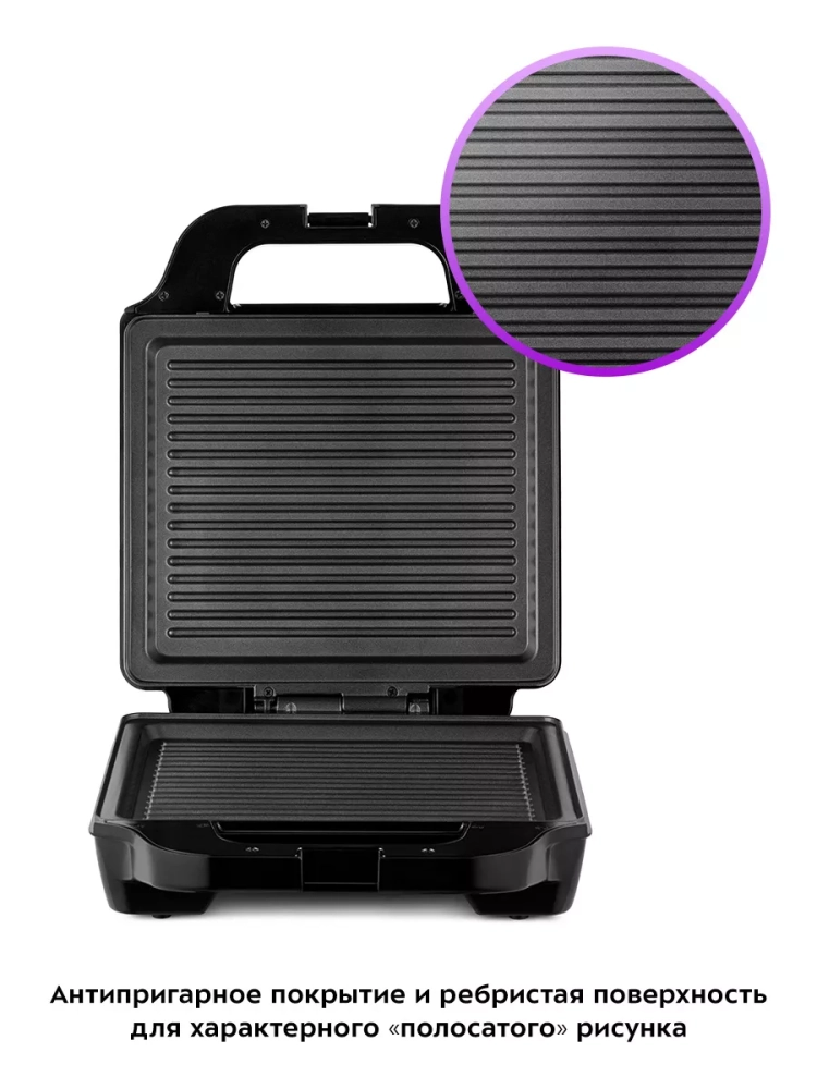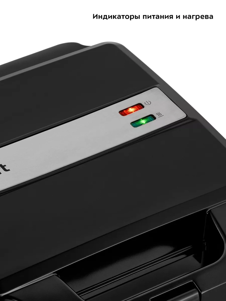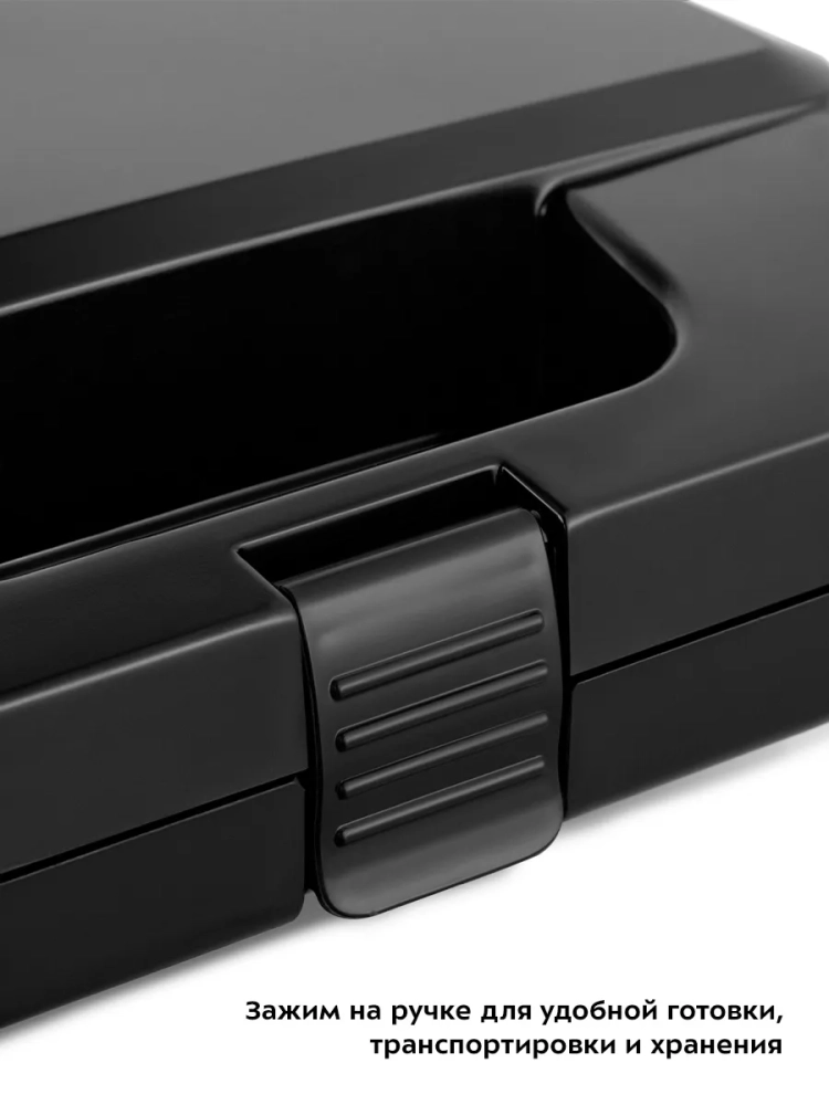 Бутербродница оснащена термостатом для поддержания температуры панелей, а также индикаторами питания и нагрева. Отсек на нижней части корпуса предназначен для удобного хранения шнура питания. Зажим на ручке удерживает крышку бутербродницы в закрытом состоянии, что делает готовку, транспортировку и хранение более удобными.