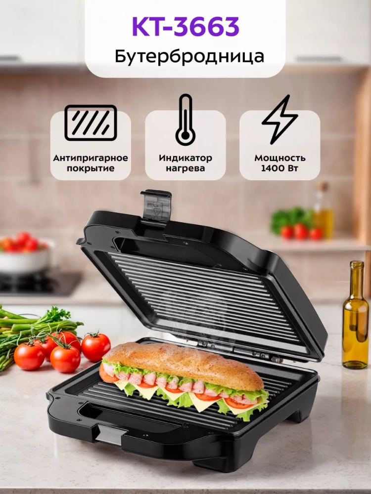 Бутербродница Kitfort КТ-3663 предназначена для приготовления бутербродов, панини, сэндвичей, тостов, жарки сосисок и овощей.