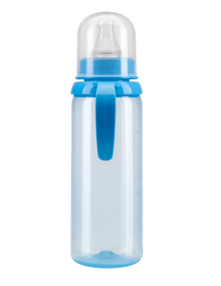 Бутылочка для кормления КУРНОСИКИ 250мл с ручками и силиконовой молочной соской, с 6 месяцев