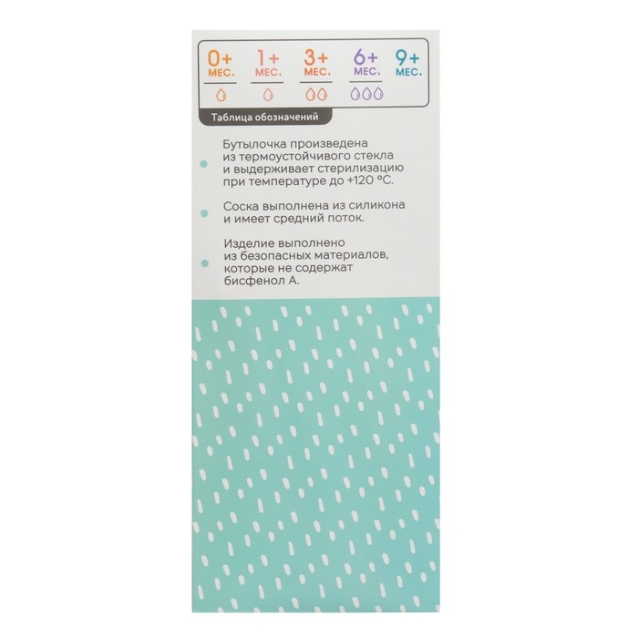 Бутылочка имеет мягкую и гибкую соску, которая не слипнется и будет удобно располагаться у малыша во рту.