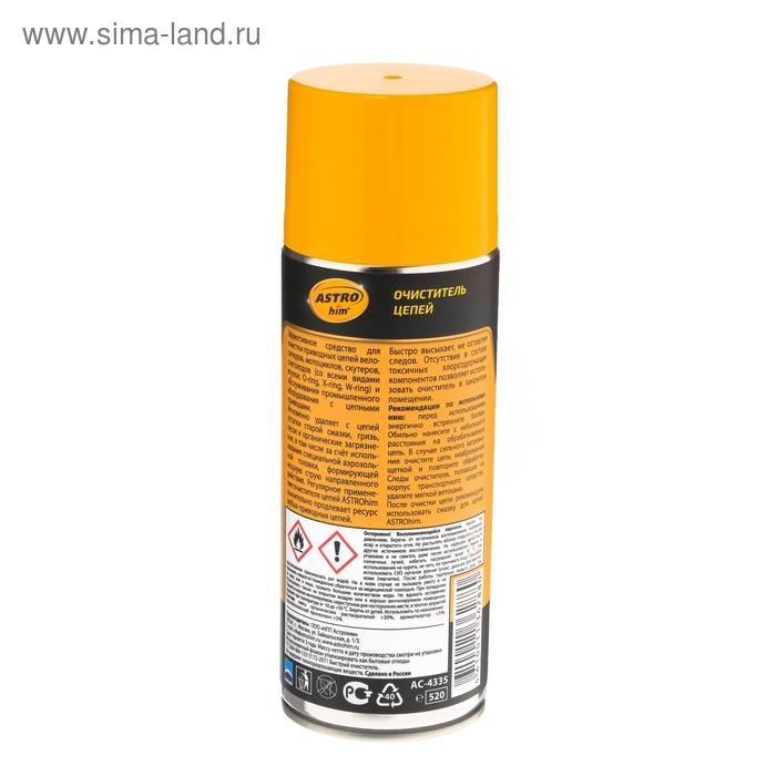 Мгновенно удаляет с цепей остатки старой смазки, грязь, песок и органические загрязнения, в том числе за счёт использования специальной аэрозольной головки, формирующей мощную струю направленного действия. Регулярное применение очистителя значительно продлевает ресурс приводных цепей. Быстро высыхает, не оставляя следов. После очистки цепи рекомендуется использовать смазку для цепей ASTROhim.
