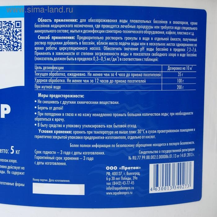 Быстрый стабилизированный хлор Aqualeon гранулы, 5 кг