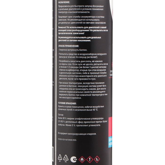 Предназначен для быстрого запуска бензиновых и дизельных двигателей в условиях пониженных температур и высокой влажности. Продлевает срок службы аккумулятора и системы зажигания. Не рекомендуется использовать для дизельных двигателей со свечами накаливания.