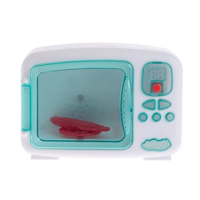 Устройство выглядит как настоящее: чтобы открыть дверцу, достаточно нажать на кнопку, а когда она закроется, тарелка внутри начнёт вращаться. Клавиши светятся и информируют о нескольких режимах приготовления. Ребёнок выберет один из них и включит прибор. Как только блюдо будет готово, раздастся характерный звук — можно накрывать на стол.