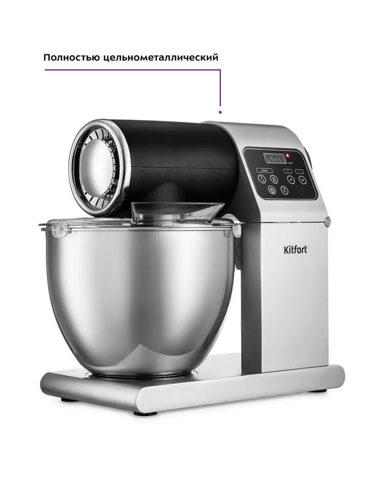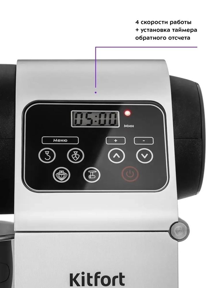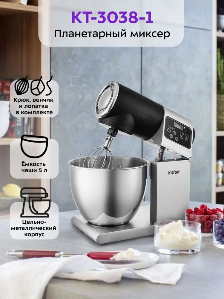 Многофункциональный и мощный цельнометаллический планетарный миксер Kitfort КТ-3038 поможет вам смешать ингредиенты, взбить яичный белок или сливки, приготовить картофельное пюре, соус, крем, мусс, замесить жидкое тесто для блинов и крутое для пельменей и пирогов.