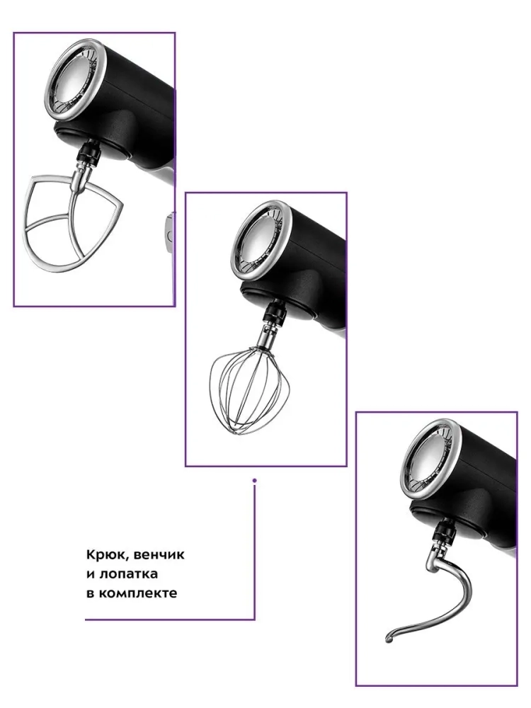 В комплекте идут насадки для взбивания, перемешивания и приготовления пюре, крюк для замеса крутого теста.