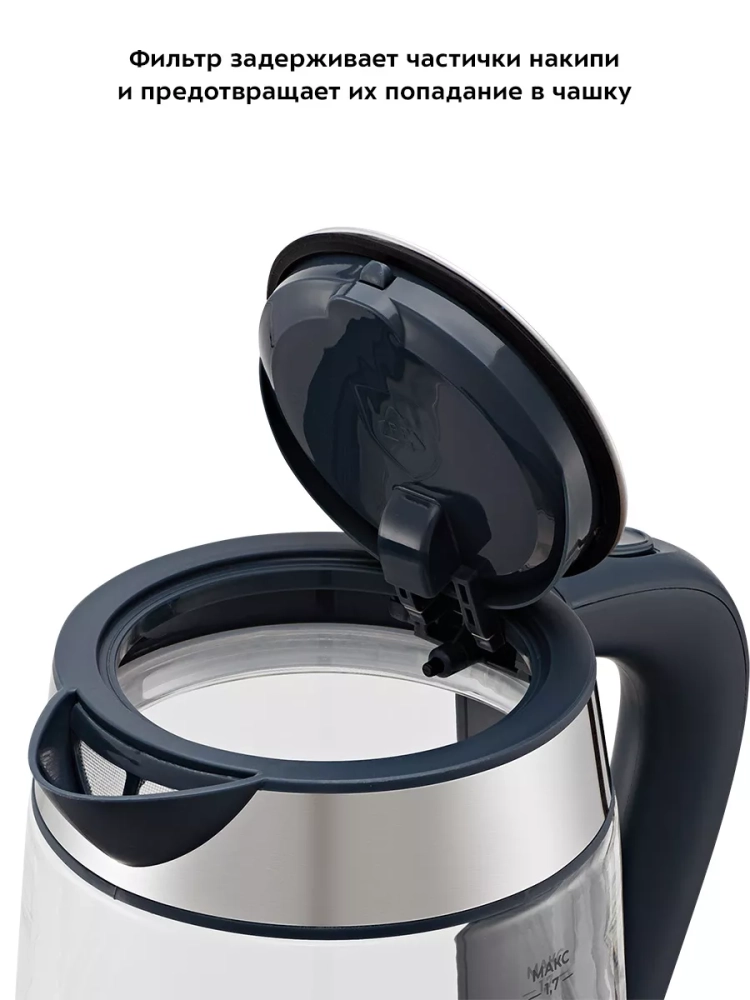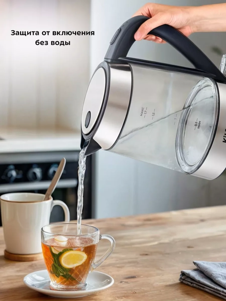Чайник автоматически отключается при закипании, имеет защиту от перегрева и от включения без воды.