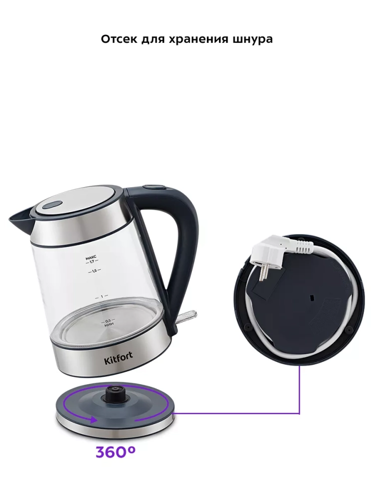 Подставка с центральным контактом дает возможность располагать на ней чайник в любом положении, обеспечивая вращение на 360°.