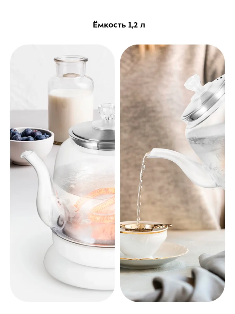 Инфракрасный нагревательный элемент у этой модели чайника находится в нижней части корпуса. Во время работы чайника нагреватель светится, что выглядит очень необычно и эффектно.