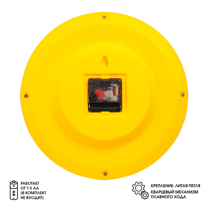 Круглые настенные часы с бесшумным кварцевым механизмом станут отличным украшением детской комнаты. Общий диаметр часов 28 см, большие четкие цифры, диаметр циферблата 24 см. Крепление-литая петля. Циферблат защищён прочным минеральным стеклом. Кварцевый механизм имеет плавный ход и работает от одной батарейки типа АА. Батарейки в комплект не входят.