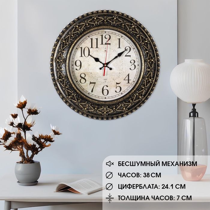 Часы настенные, интерьерные, d-38 см, корпус черный с золотом