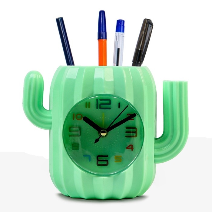 Часы - органайзер с будильником представлены в современном дизайне в форме кактуса, они отлично впишутся в интерьер. Интерьерные часы станут прекрасным декором для дома и дачи, их можно поставить как на прикроватную тумбочку в спальне, детской комнате, гостиной так и на стол или на комод в зале, холле или на кухне. Будильник настольный имеет кварцевый механизм, который гарантирует высокую точность хода. Часы настольные обладают громким будильником, ребенку и вам будет комфортно просыпаться, на работу и в школу. Будильник на батарейках не требует частой замены батареек благодаря экономичному механизму. В карандашнице можно хранить канцелярские принадлежности: цветные карандаши, кисти, ручки, ножницы.