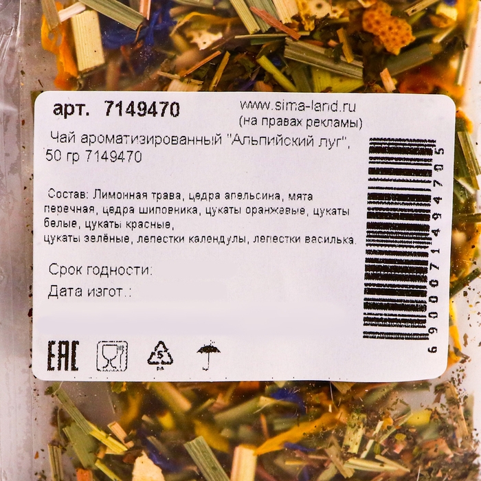 Травяной напиток на основе лимонной травы, перечной мяты, цедры шиповника и апельсина. В состав также добавлены цукаты тропических фруктов, лепестки василька и календулы.