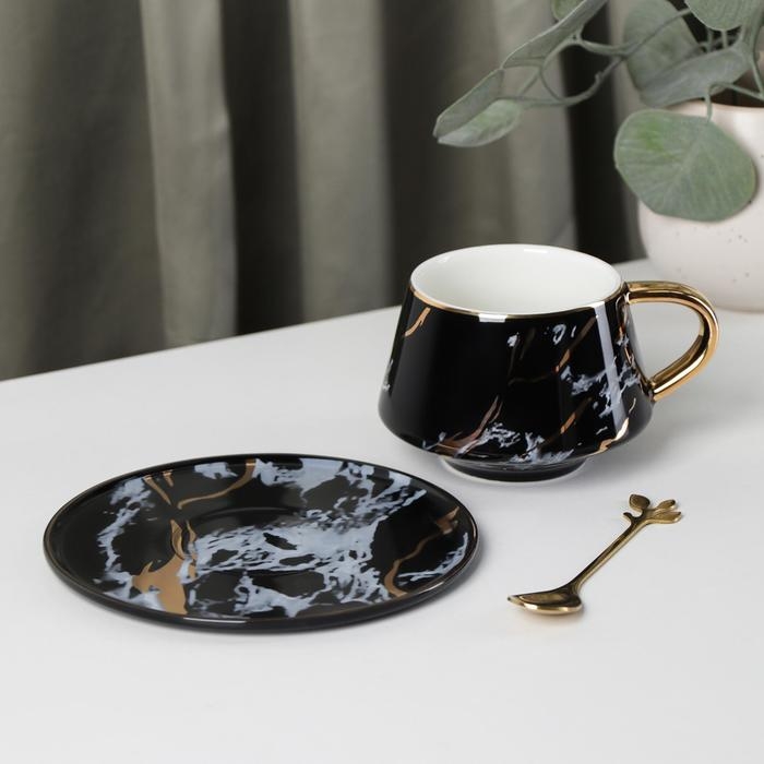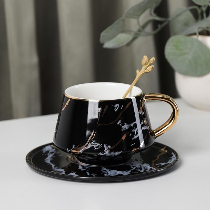 Чайная пара керамическая с ложкой Gold, 2 предмета: чашка 240 мл, блюдце d=14,8 см, цвет чёрный