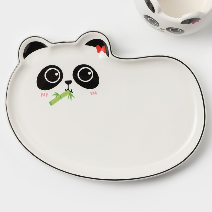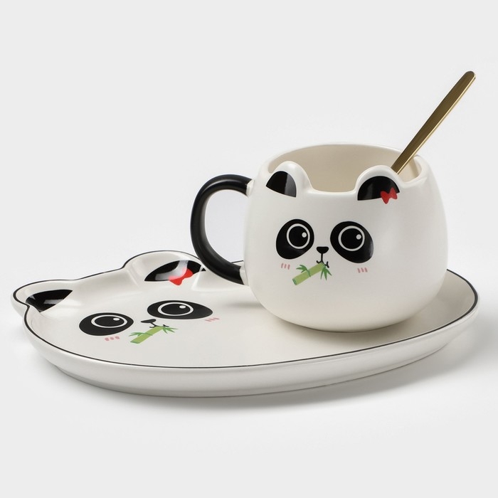 Чайная пара керамическая с ложкой «Панда», 2 предмета: кружка 180 мл, блюдце, рисунок МИКС
