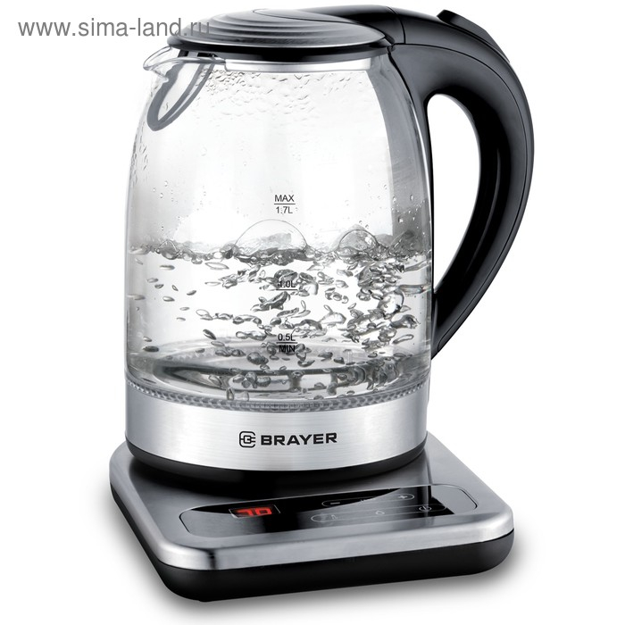 Чайник электрический BRAYER BR1003, стекло, 1.7 л, 2200 Вт, регулировка t°, серебристый