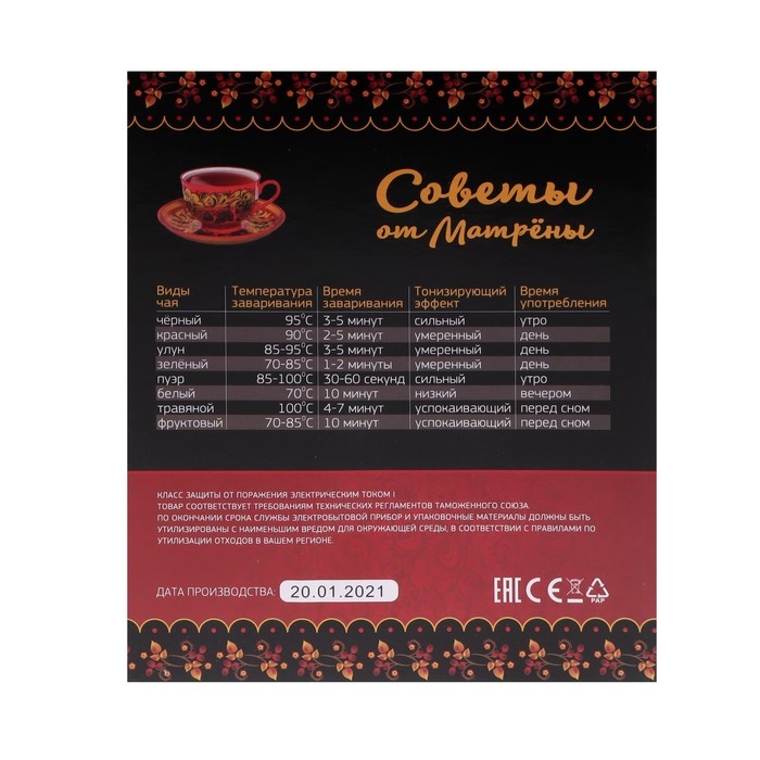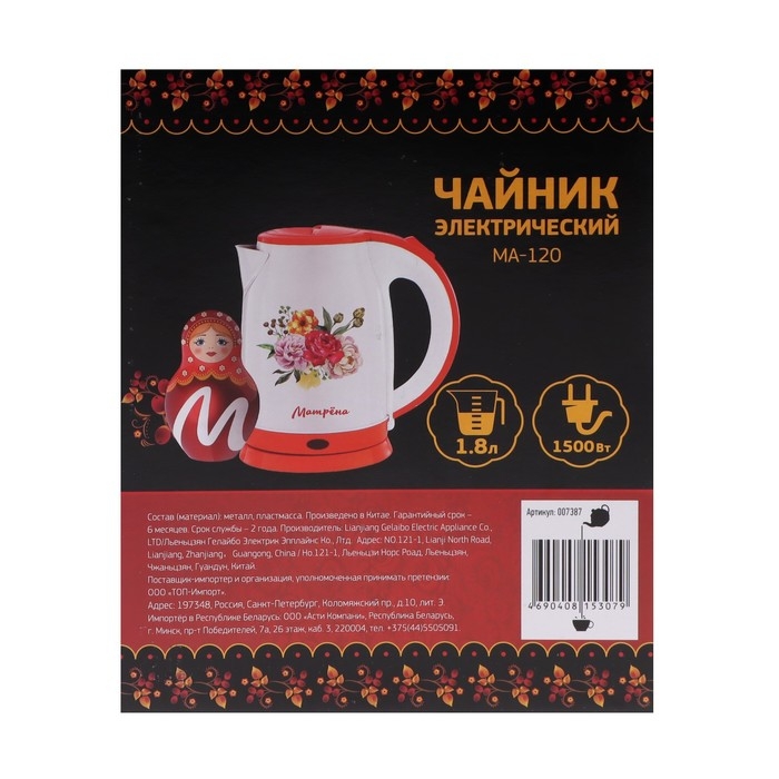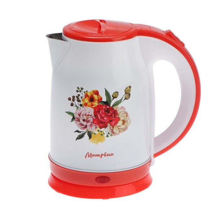 Чайник электрический МАТРЁНА MA-120, металл, 1.8 л, 1500 Вт, бело-оранжевый с рисунком