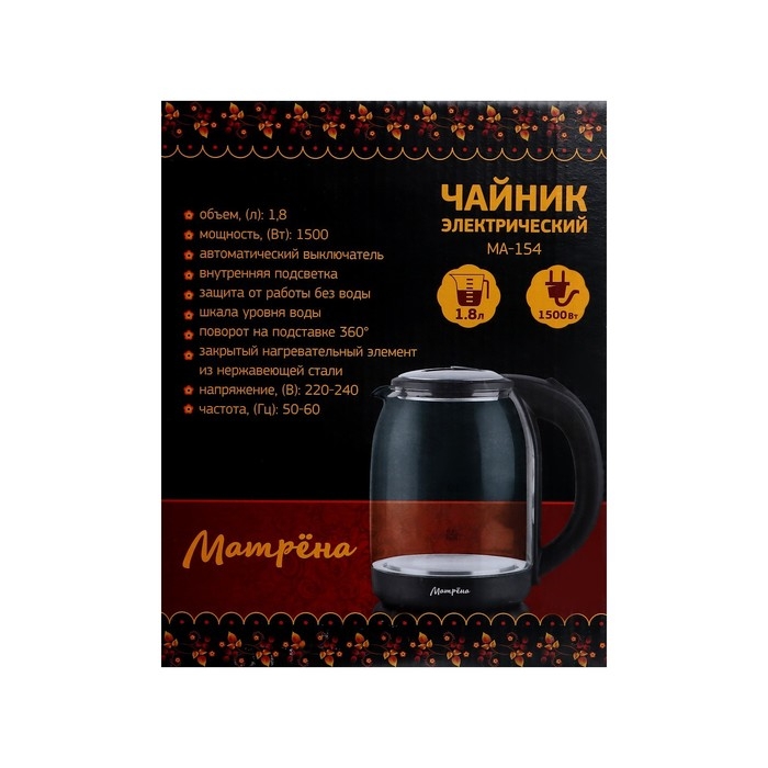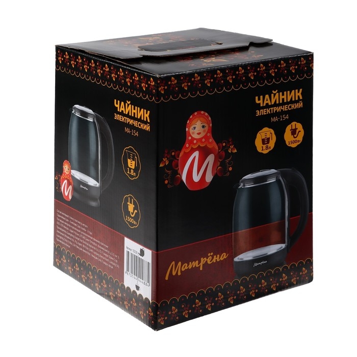 Чайник электрический "Матрёна" MA-154, стекло, 1.8 л, 1500 Вт, серый