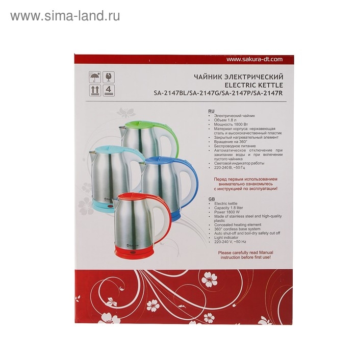 Чайник электрический Sakura SA-2147R, металл, 1.8 л, 1800 Вт, красный