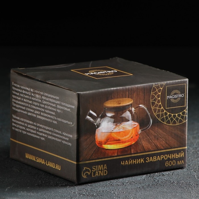 Чайник стеклянный заварочный с бамбуковой крышкой и металлическим фильтром Magistro «Эко», 600 мл