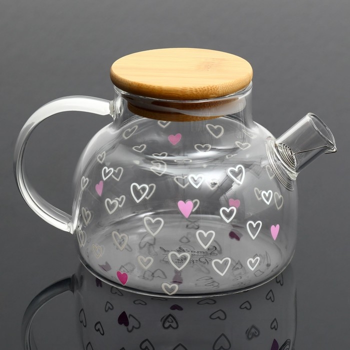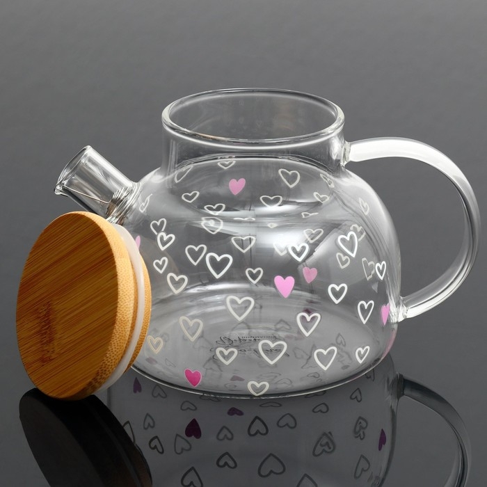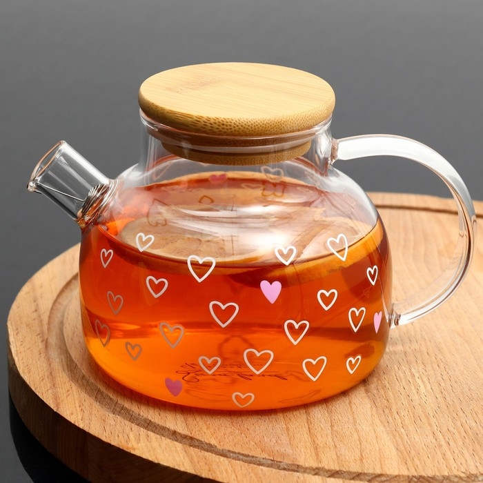 Чайник стеклянный заварочный с бамбуковой крышкой «Сердечки», 600 мл