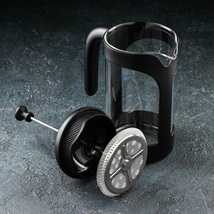 Стеклянный френч-пресс хорошо держит тепло, раскрывает вкус любимых напитков. Стальной поршень не вступает в реакцию с жидкостью, не наделяет ее металлическим привкусом.Принцип работы френч-пресса прост: