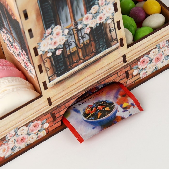 Чайный домик – это необычная упаковка для хранения чая. Он поможет навести порядок на обеденном столе, а также станет его яркой деталью. Чайные пакетики закладываются сверху внутрь домика и вынимаются снизу.