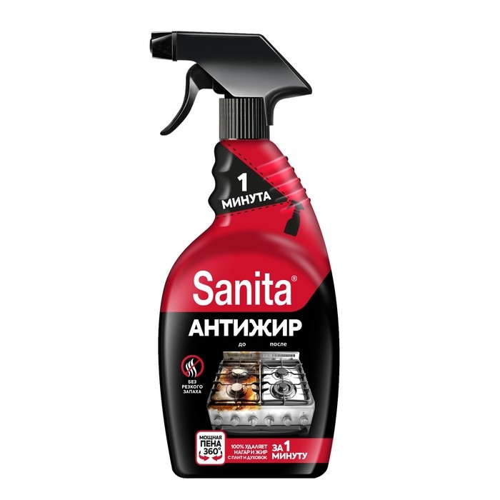 Спрей для кухни Sanita «1 минута» — универсальное средство для кухонных поверхностей. Эффективно удаляет жир, нагар и въевшуюся грязь.
