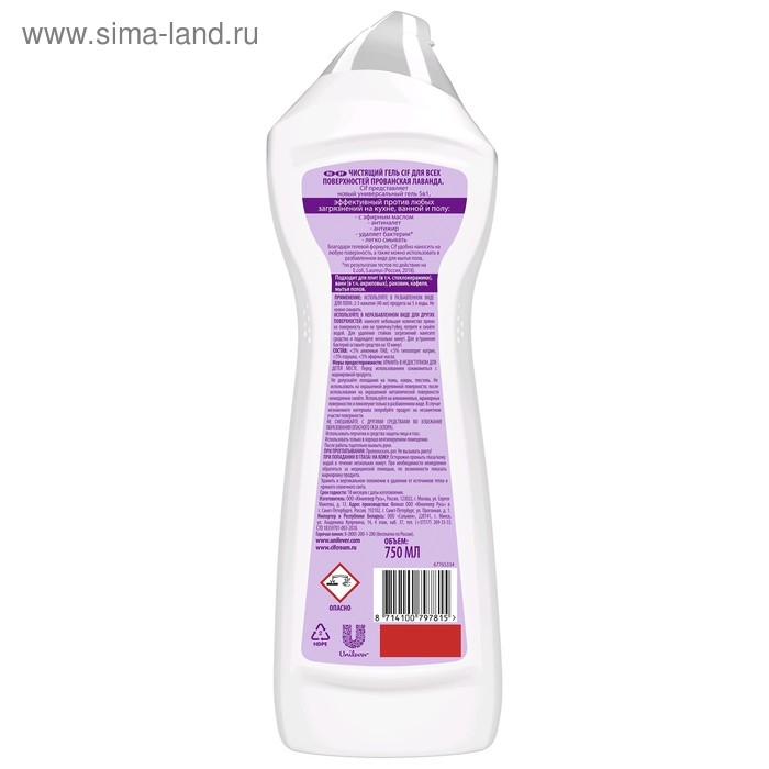 Чистящий гель Cif «Прованская лаванда», универсальный, 750 мл - это идеальное средство для тех, кто ценит качество и эффективность уборки.