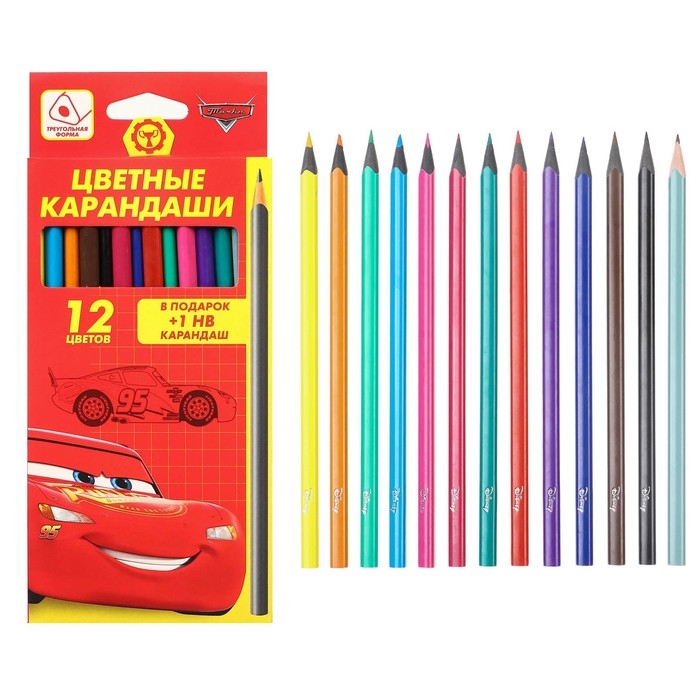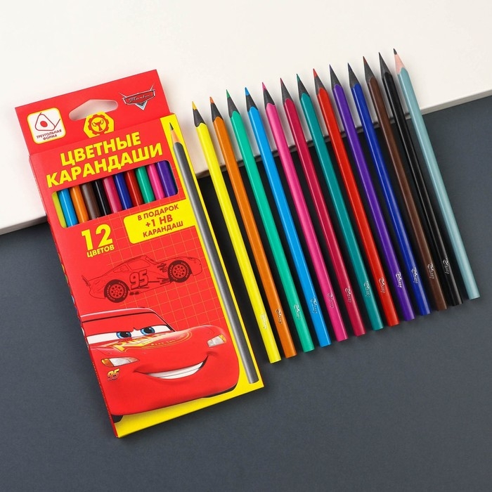Цветные карандаши, 12 цветов, трехгранные, Тачки