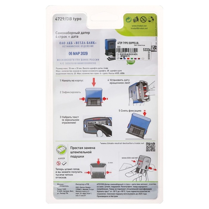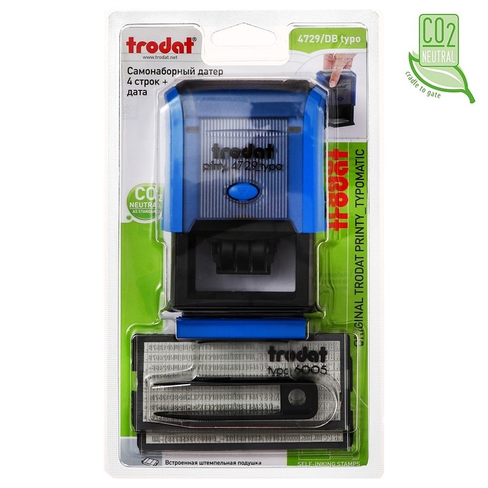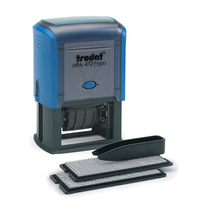 Датер самонаборный автоматический Trodat PRINTY 4729 typo, 4 строки + дата цифрами, высота шрифта 4 мм, 2 кассы, 50 х 30 мм, корпус синий