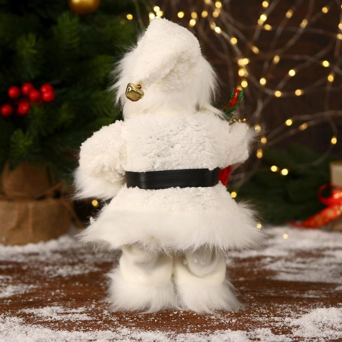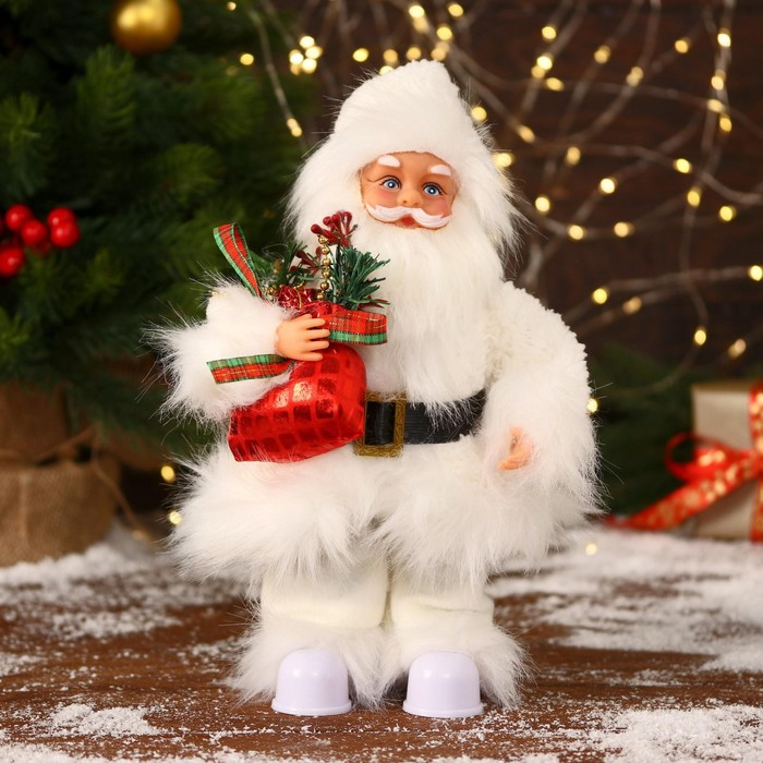 Дед Мороз "В меховом белом костюмчике, с мешком" двигается, 11х30 см
